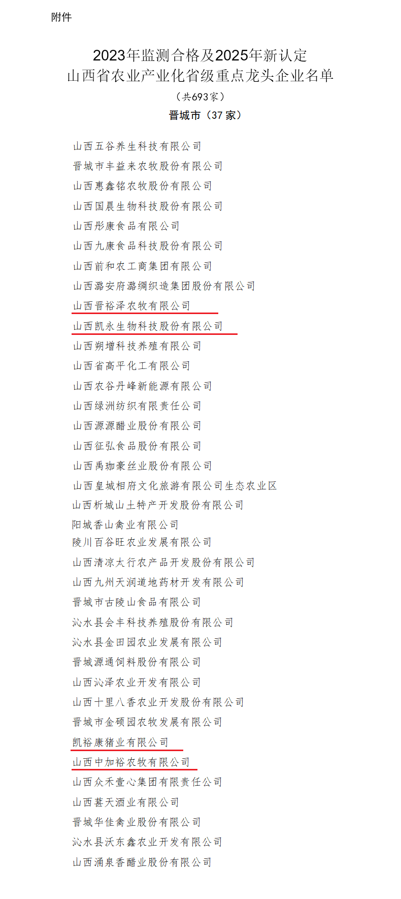 此次山西晋裕泽农牧有限公司、山西凯永生物科技股份有限公司、凯裕康猪业有限公司、山西中加裕农牧有限公司同时荣获山西省农业产业化省级重点龙头企业称号,是对凯永集团多年来坚持农业产业化发展道路的充分肯定。